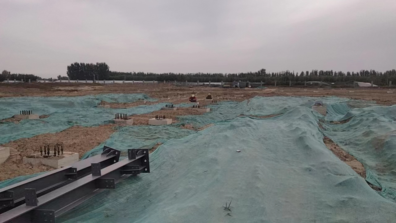 2023年11月3日饒陽宇潤光電5-7#車間鋼結構工程鋼柱進場施工。